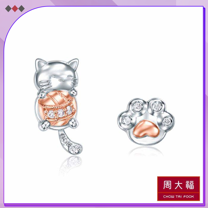 【周大福】小心意系列 貓咪抱毛球18K金鑽石耳環