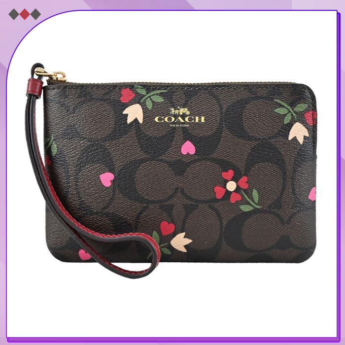 【COACH】立體馬車LOGO愛心小花印花PVC手拿包(咖啡)