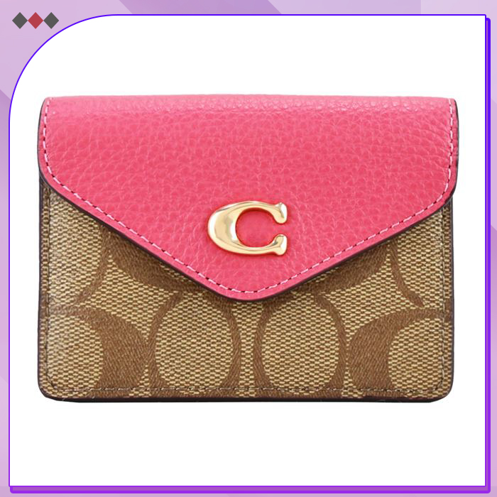 【COACH】金屬C 緹花LOGO拼接皮革卡片夾/零錢包(卡其草莓)