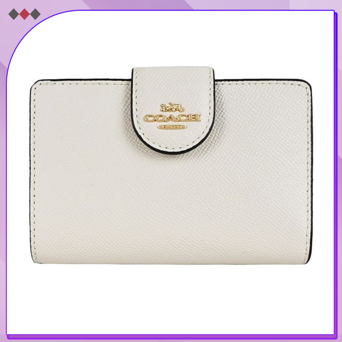 【COACH】立體馬車LOGO防刮皮革釦式雙摺中夾(粉筆白)