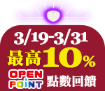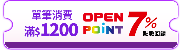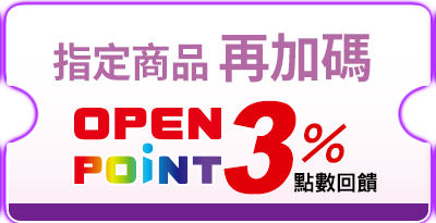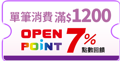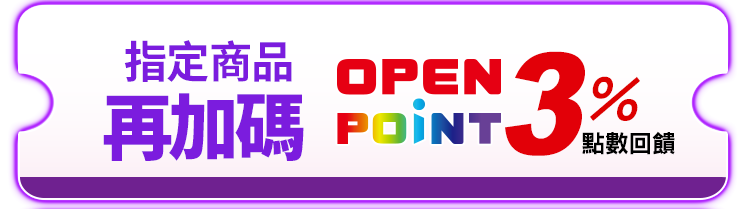 - OPENPOINT點數回饋7%方式:同筆訂單商品全數到貨後(扣除退貨)14天給予點數。