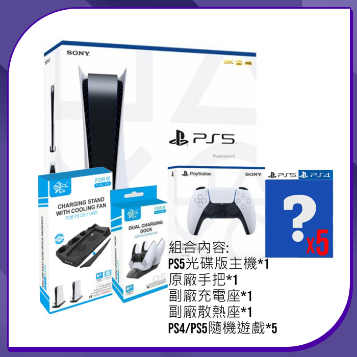 【PS5】PS5光碟主機+原廠把手+副廠充電座+副廠散熱座+5片PS隨機遊戲