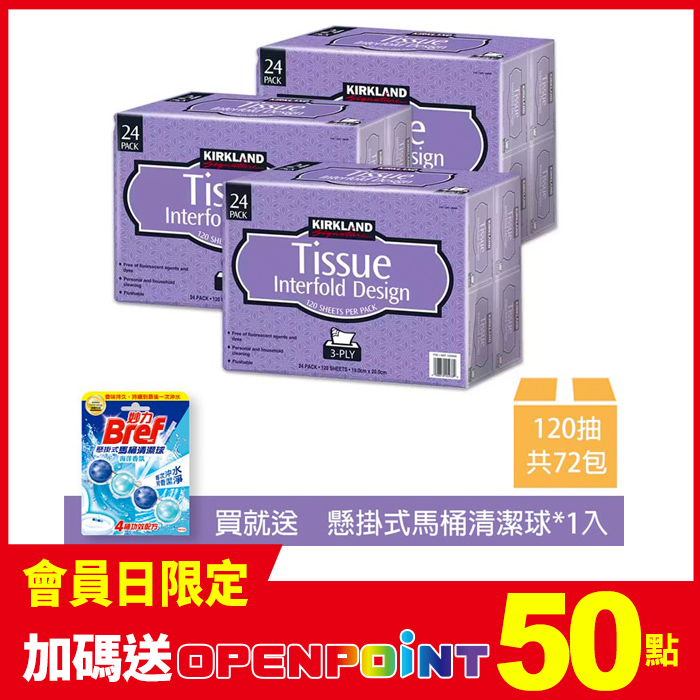 【科克蘭】三層抽取衛生紙 120張x24包x3串+馬桶清潔球*1