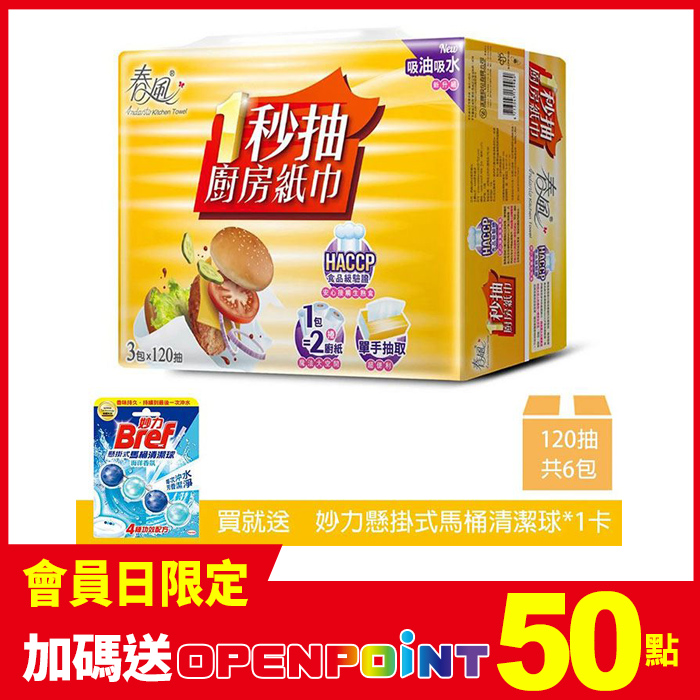 【春風】一秒抽取式廚房紙巾 120抽x6包+Bref 妙力懸掛式馬桶清潔