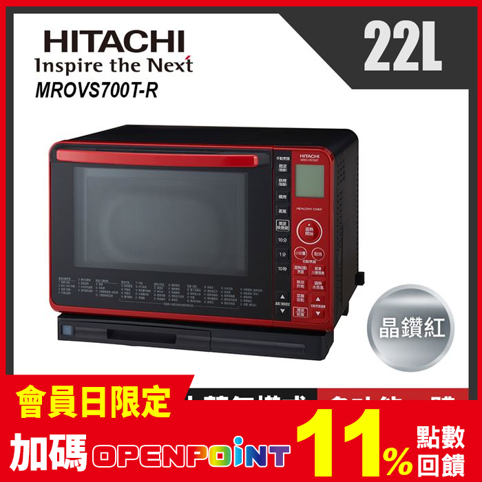 HITACHI日立 22L過熱水蒸氣烘烤微波爐MROVS700T 晶鑽紅