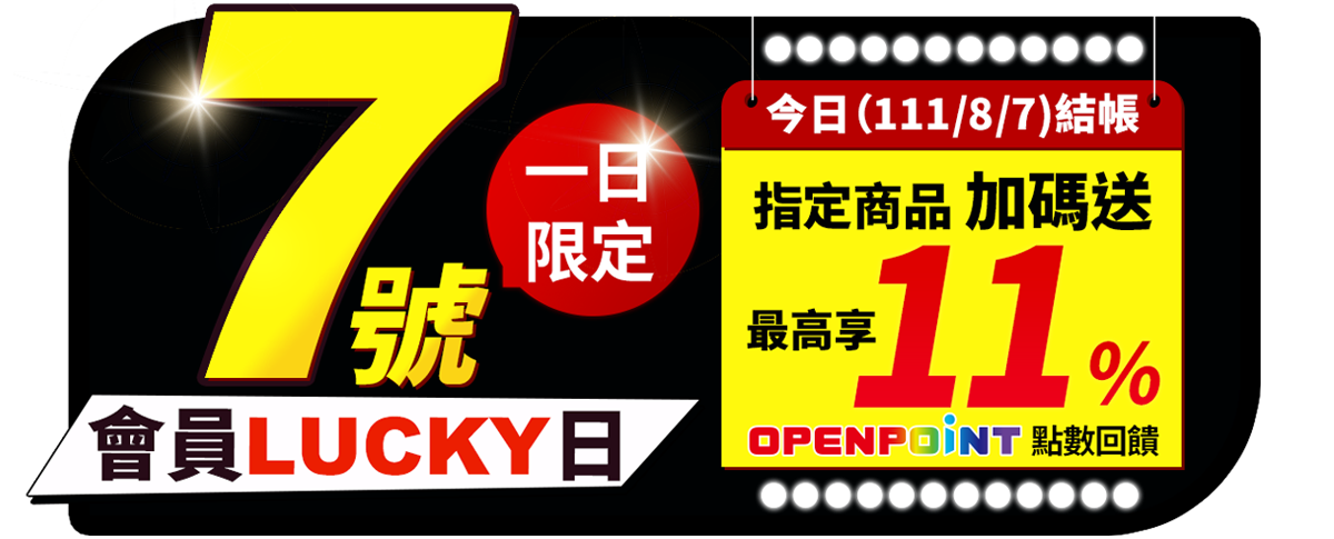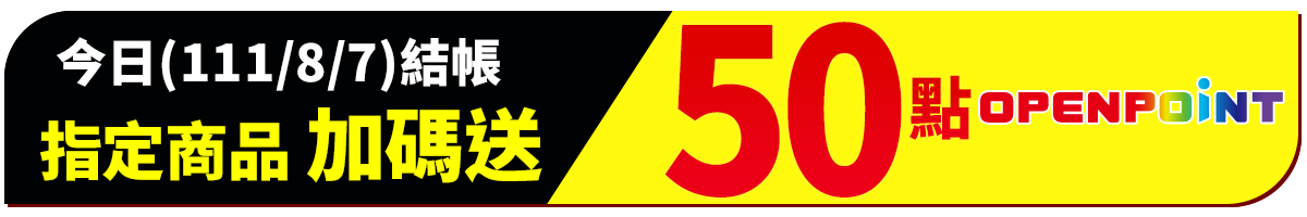 - 指定商品回饋50點 OPENPOINT回饋方式:於本活動時間111/7/27 00:00~ 111/7/27 23:59內購買指定商品(包含完成信用卡支付以及7-ELEVEN實體門市繳費),將於111/9/26前匯入50點OPENPOINT。(此區商品不另行回饋11%OPENPOINT點數)