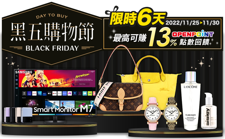 - 三星品牌館、iPhone專區回饋7%計算方式:2022/11/25~2022/11/30 購買活動頁上之三星品牌館、iPhone專區商品以支付金額的7%進行點數回饋(內含基本點數0.33%或0.5%,計算以四捨五入至小數點後第二位)。 每個會員帳號回饋上限1500點,三星品牌館、iPhone專區商品恕不參加黑五購物節單筆消費1313元,點數回饋6%活動。