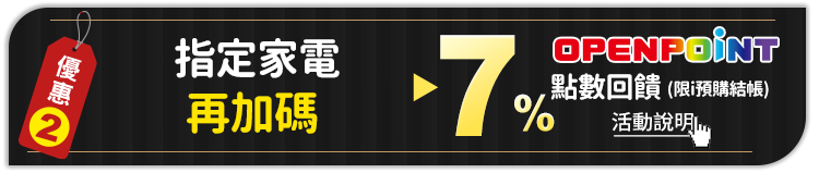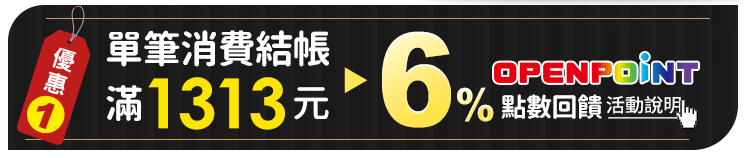 - OPENPOINT點數回饋6%方式:同筆訂單商品全數到貨後(扣除退貨)14天給予點數。