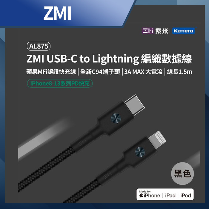 【ZMI】TYPE-C to Lightning蘋果MFi認證 充電編織線 1.5M黑