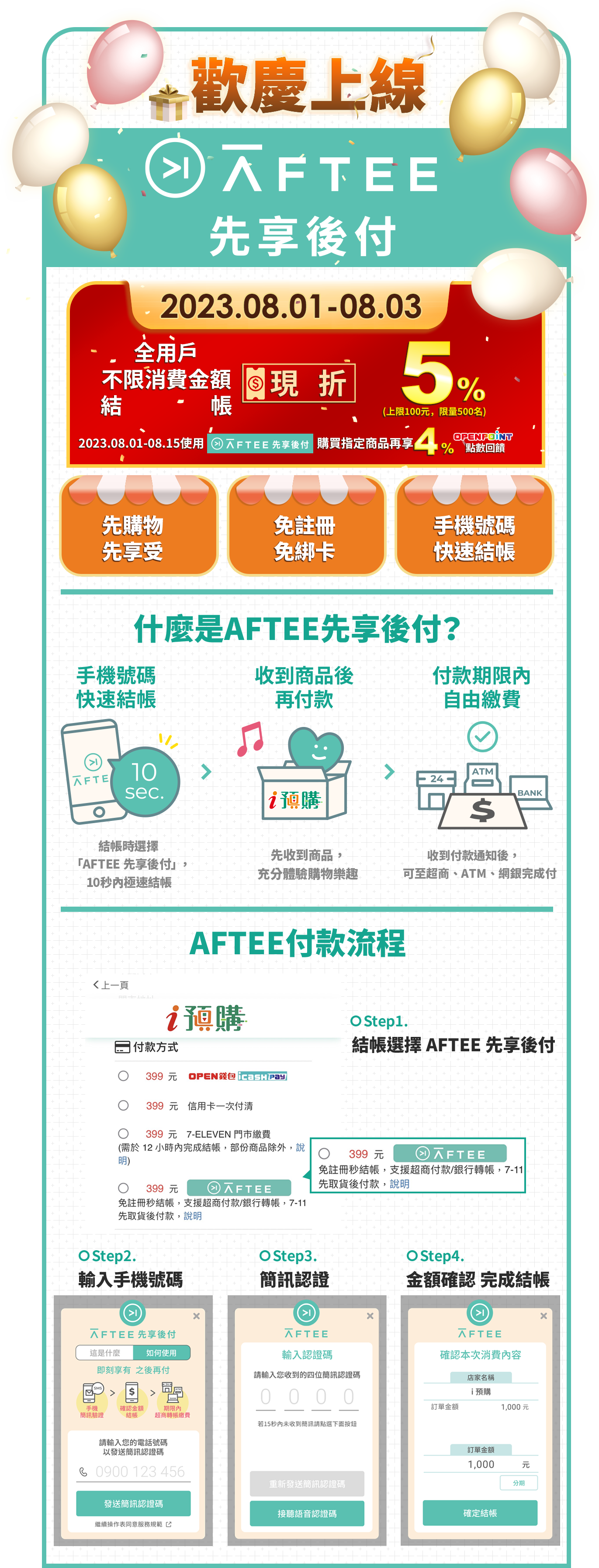 - 活動期間內於i預購消費並使用【AFTEE先享後付】結帳,即可享實際消費金額5%現折回饋,單筆訂單上限回饋100元,限量500名。