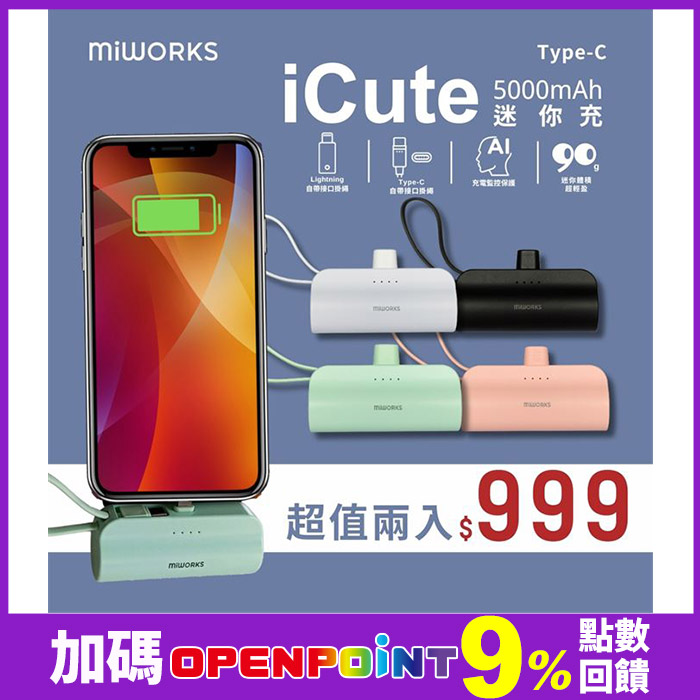 【米沃】迷你充iCute隨身行動電源5000mAh-C Type C接頭