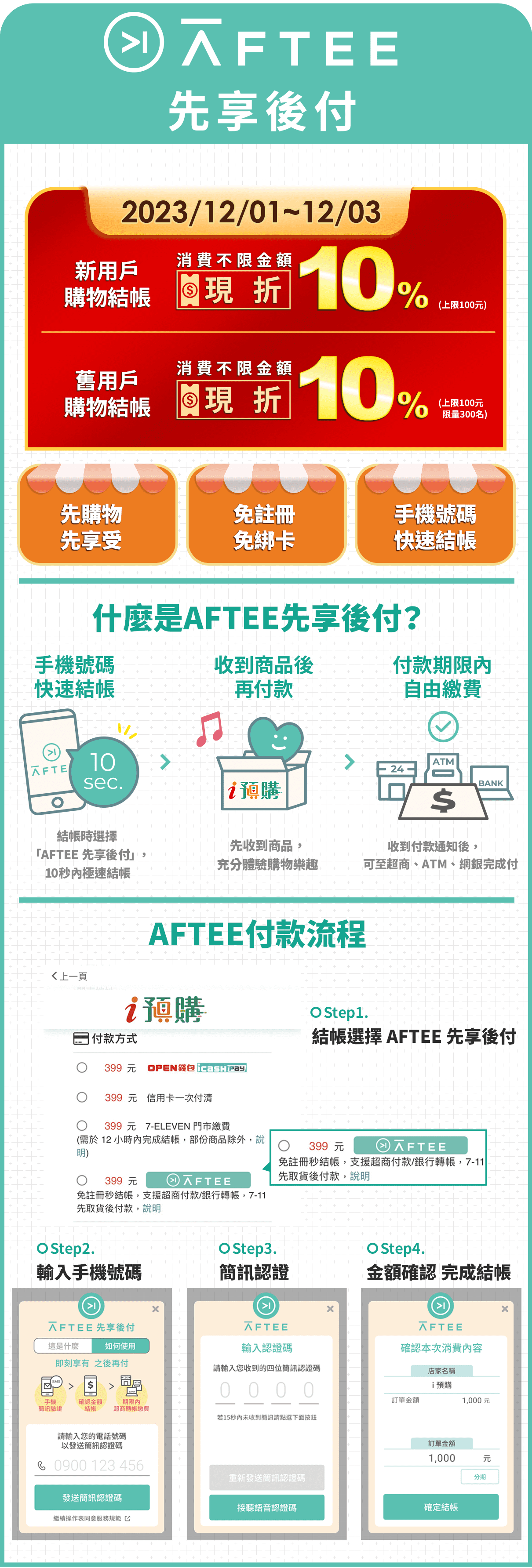 - 活動說明:活動期間內,凡AFTEE新用戶於【 i預購/i划算】消費不限金額,並使用【AFTEE先享後付】結帳, 即可享實際消費金額10%現折回饋,單筆訂單上限回饋100元。