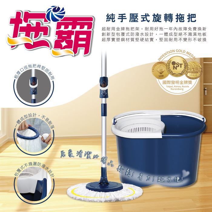 《拖霸》手壓旋轉拖把組-基本款(1拖2布1桶)