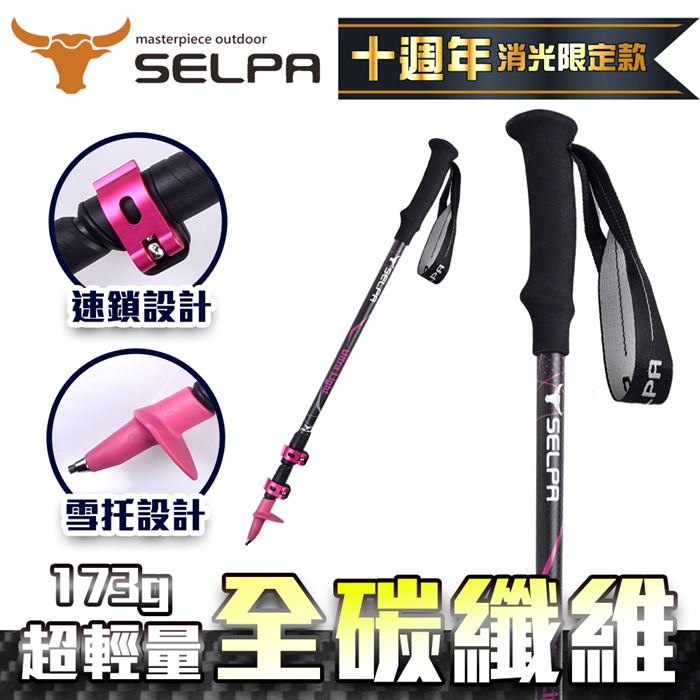 【韓國SELPA】凜淬碳纖維三節式外鎖登山杖 單入(粉色)