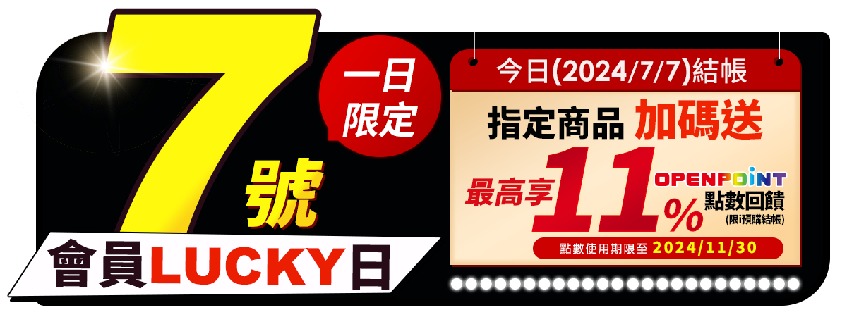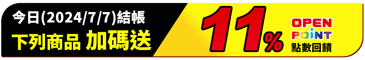 - 本活動加碼贈11% OPENPOINT點數回饋計算方式:於活動時間2024/7/7 00:00~23:59內,於i預購購買標示之指定商品,並完成訂單結帳或繳費,即可獲得商品實付金額之加碼OPENPOINT點數回饋。(內含基本點數0.33%或0.5%,計算以四捨五入至小數點後第二位)。同筆訂單商品全數到貨後(扣除退貨),於取貨後14天回饋至帳戶。點數使用效期至2024/11/30為止,逾期未使用不予補發。