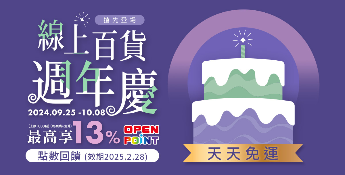- 本活動回饋之3% OPENPOINT點數計算方式:於本活動時間2024/09/25 00:00~2024/10/8 23:59內完成單筆訂單結帳滿$1,200,以支付金額的3%進行點數回饋。每個會員帳號回饋上限1000點。本加碼點數於同筆訂單商品全數到貨後(扣除退貨),14天後給予點數。本檔活動贈送之點數可使用至使用至2025/2/28止,逾期未使用不予補發。(3%點數回饋含基本點數0.33%(OPEN錢包支付享0.5%),計算以四捨五入至小數點後第二位)。例如:於i預購或i划算消費購物金額$1,200,回饋OPENPOINT點數36點,每個會員帳號回饋上限1000點。