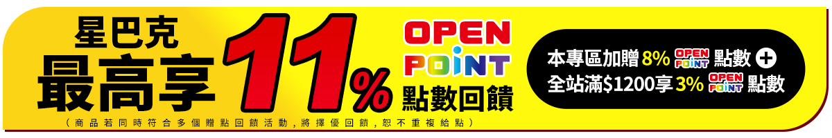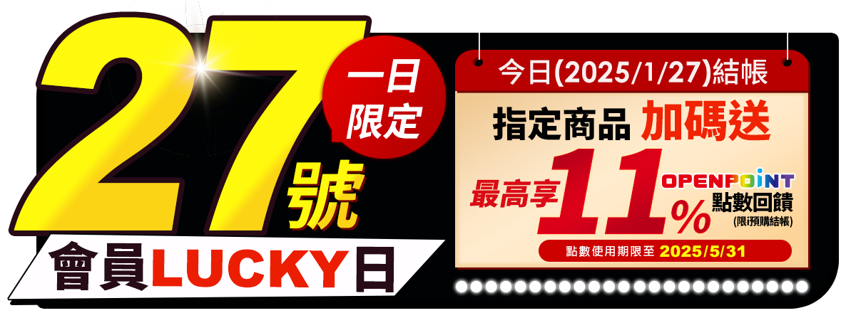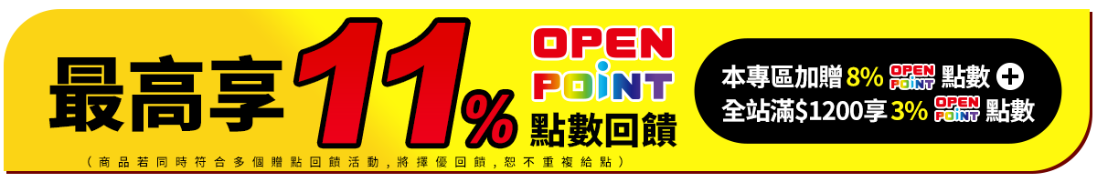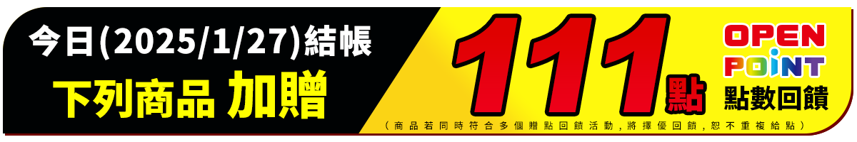 - 本活動指定商品最高享11% OPENPOINT點數回饋計算方式:【指定商品加碼8%回饋】+【全站滿$1200享3%回饋】,於活動時間2025/1/27 00:00~23:59內,於i預購購買標示之指定商品,並完成訂單結帳或繳費,即可獲得商品實付金額之加碼OPENPOINT點數回饋。(內含基本點數0.33%或0.5%,計算以四捨五入至小數點後第二位)。同筆訂單商品全數到貨後(扣除退貨),於取貨後14天回饋至帳戶。點數使用效期至2025/5/31為止,逾期未使用不予補發。