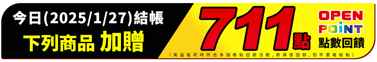 - 本活動指定商品加碼贈711/111點 OPENPOINT點數計算方式:於活動時間2025/1/27 00:00~23:59內,於i預購購買標示之指定商品,並完成訂單結帳或繳費,即可獲得加碼之OPENPOINT點數回饋。(內含基本點數0.33%(OPEN錢包支付享0.5%),計算以四捨五入至小數點後第二位)。同筆訂單商品全數到貨後(扣除退貨) ,於取貨後14天回饋至帳戶。點數使用效期至2025/5/31為止,逾期未使用不予補發。