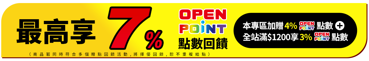 - 本活動指定商品最高享7% OPENPOINT點數回饋計算方式:【指定商品加碼4%回饋】+【全站滿$1200享3%回饋】,於活動時間2025/1/27 00:00~23:59內,於i預購購買標示之指定商品,並完成訂單結帳或繳費,即可獲得商品實付金額之加碼OPENPOINT點數回饋。(內含基本點數0.33%或0.5%,計算以四捨五入至小數點後第二位)。同筆訂單商品全數到貨後(扣除退貨),於取貨後14天回饋至帳戶。點數使用效期至2025/5/31為止,逾期未使用不予補發。