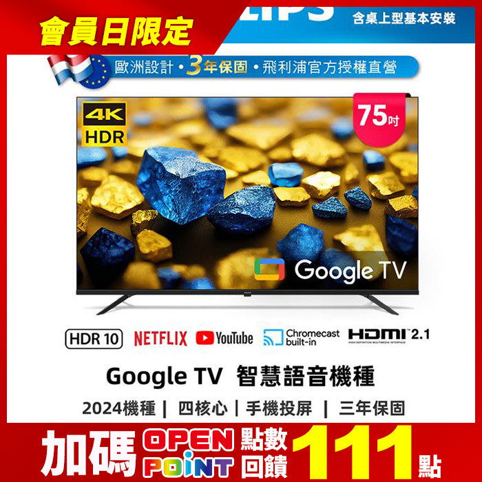 75型4K Google TV 智慧顯示器(75PUH7139)GoogleTV原價$32900特價$25999