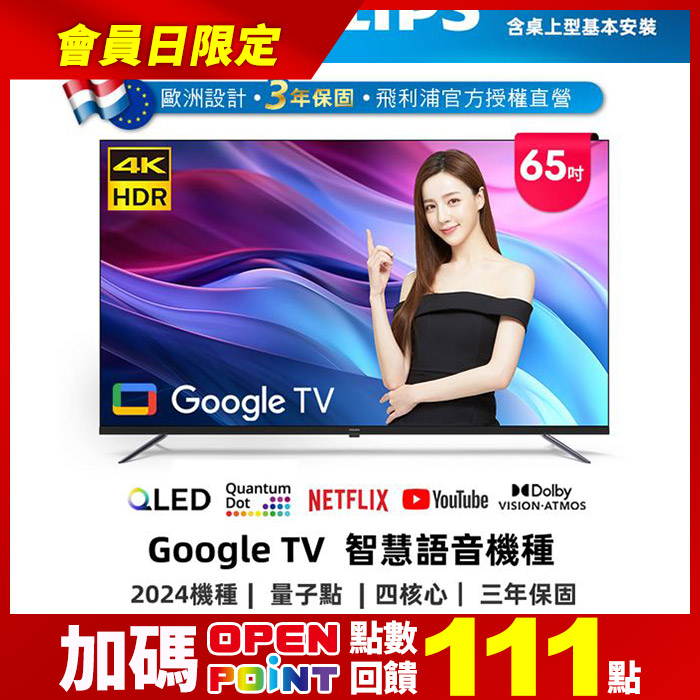 65型4K QLED Google TV 智慧顯示器(65PQT8159)智慧聯網原價$28900特價$24900