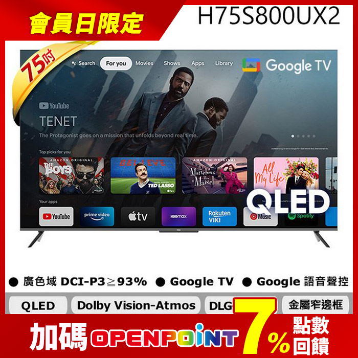 75型 QLED 智能聯網顯示器H75S800UX2QLED廣色域原價$27999特價$23988