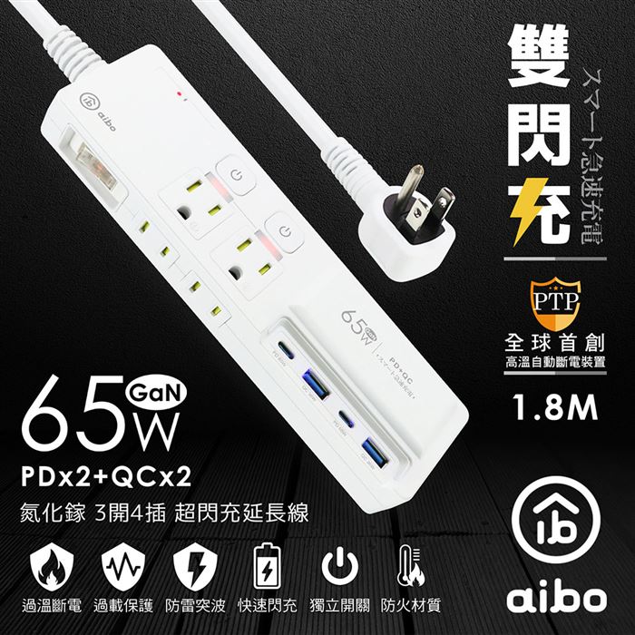 GaN氮化鎵 3開4插 高溫斷電智慧 PD65W超閃充USB延長線1.8米加入購物車折100元原價$35,801特價$1,290