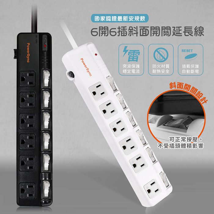 六開六插斜面開關防雷擊延長線1.8m(2色可選)斜面獨立開關設計原價$799特價$399
