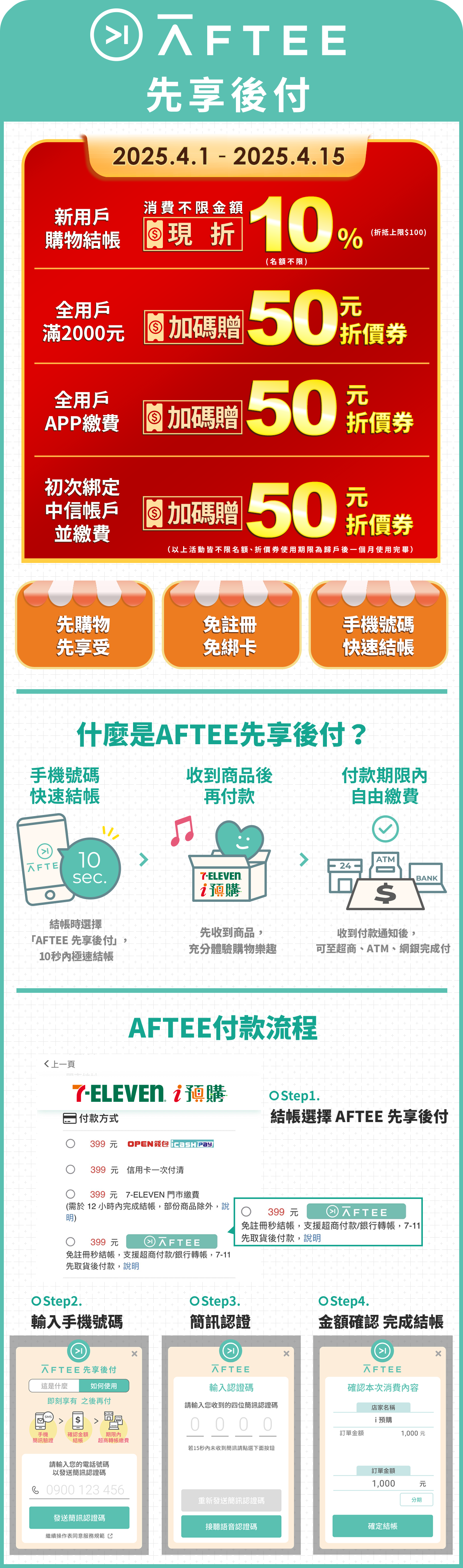 - 活動說明:活動期間內,凡AFTEE全用戶於【 i預購/i划算 】單筆消費滿$2000,且選用【 AFTEE 先享後付 】付款,並使用【 AFTEE APP 】繳費後,即贈「AFTEE 50元折價券」。折價券可用於下次【 AFTEE全通路 】消費使用。