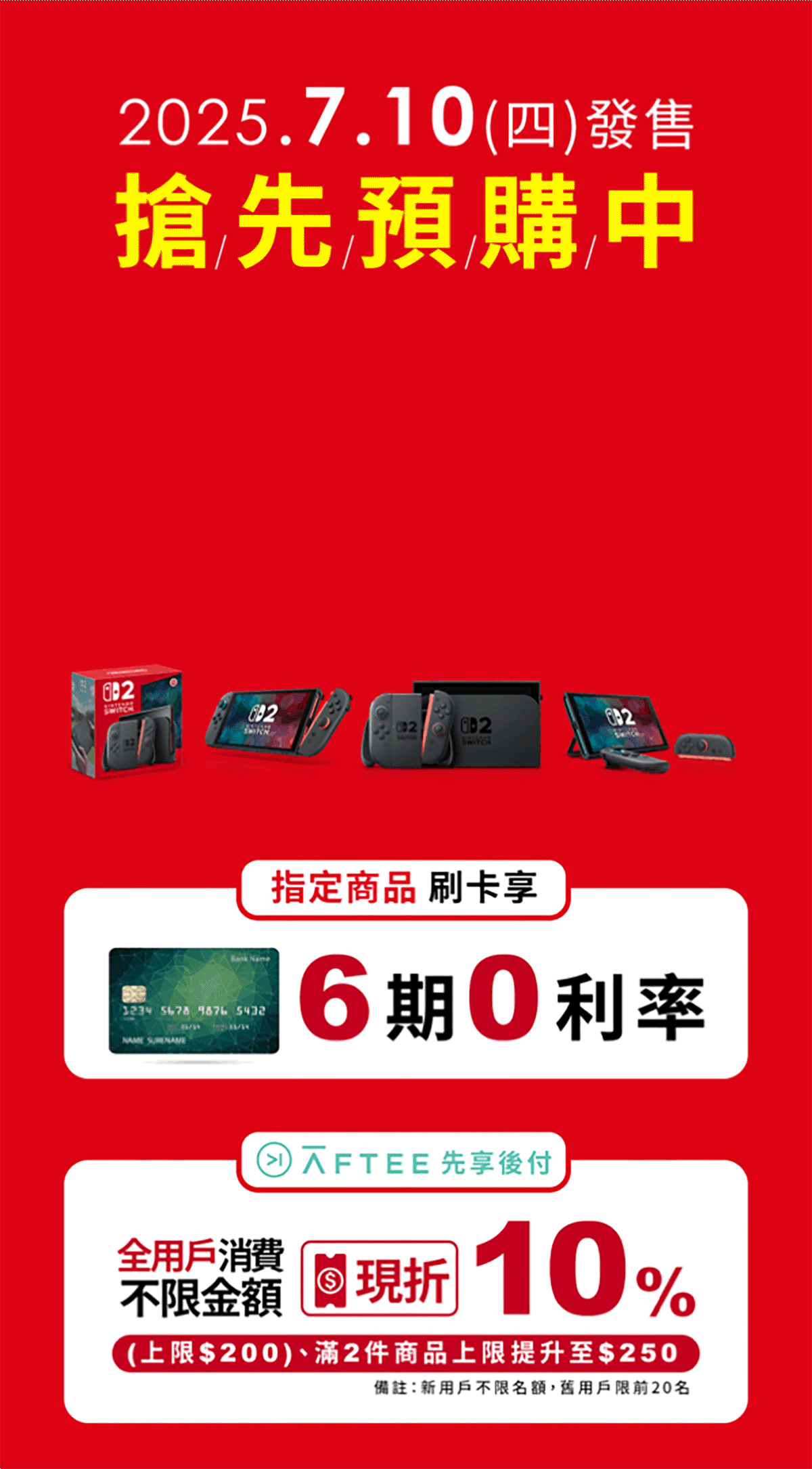 - 加碼優惠:凡於同筆訂單中購買 2 件(含)以上【 Nintendo Switch 2 】商品,亦使用【AFTEE先享後付】結帳,則可享實際消費金額 10% 現折回饋,單筆訂單回饋上限提升為 250 元。