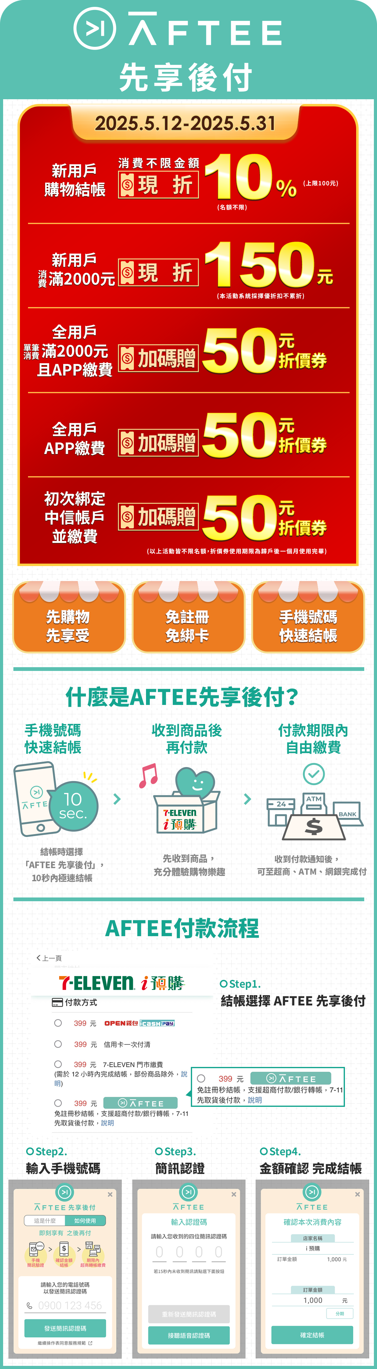 - 活動說明:活動期間內,凡AFTEE全用戶於【 7-ELEVEN i預購/i划算 】單筆消費滿$2000,且選用【 AFTEE 先享後付 】付款,並使用【 AFTEE APP 】繳費後,即贈「AFTEE 50元折價券」。折價券可用於下次【 AFTEE全通路 】消費使用。