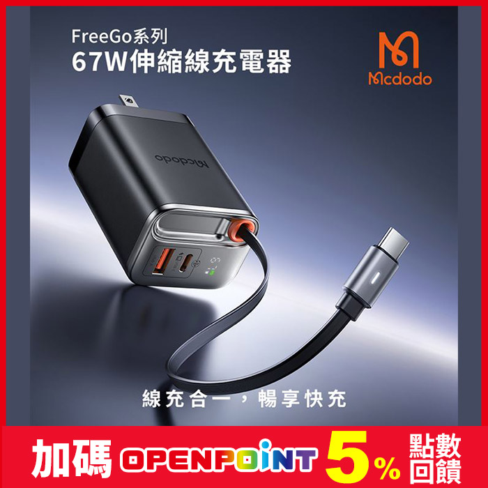 FreeGo系列 自帶伸縮線GaN 67W 快充充電器線充合一 暢享快充原價$1,190特價$990