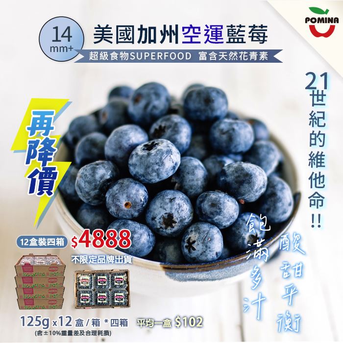 空運藍莓14mm 125g*12盒/箱*4箱酸甜均衡 粒粒飽滿原價$5,866特價$4,888