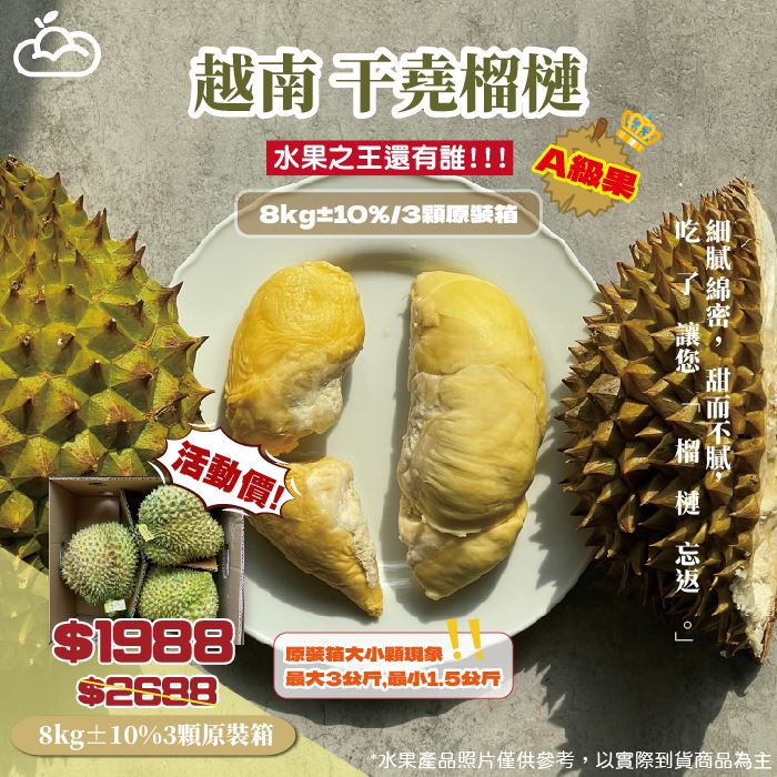 榴槤A級果8kg±10%/3顆原裝箱口感絲滑綿密原價$2,746特價$1,988
