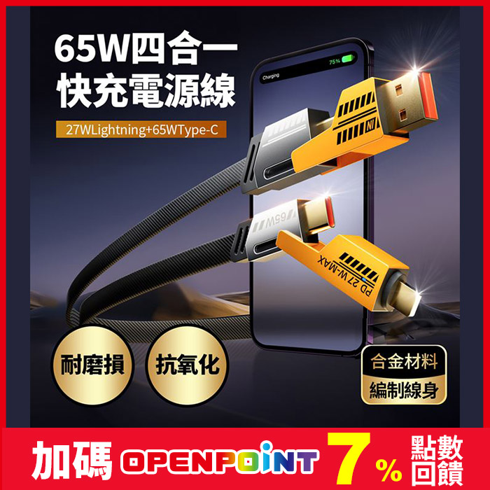 65W四合一快充電源線SU8(1M)四合一接口 急速閃充原價$399特價$199