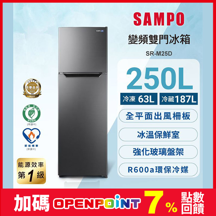 250公升一級能效定頻系列雙門冰箱 SR-M25D強化玻璃盤架原價$17,900特價$15,900