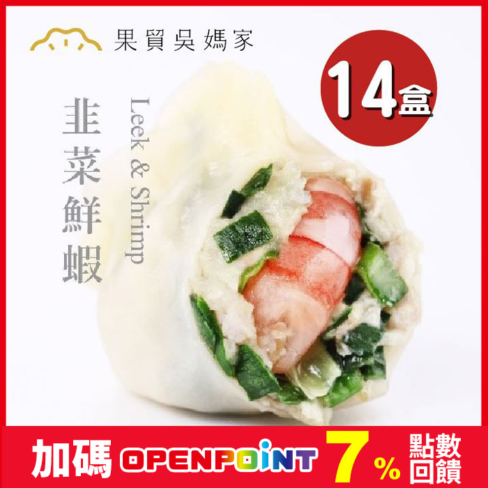韭菜鮮蝦水餃14盒(24顆/盒)爆漿餡料與扎實餃皮原價$5,800特價$5,040