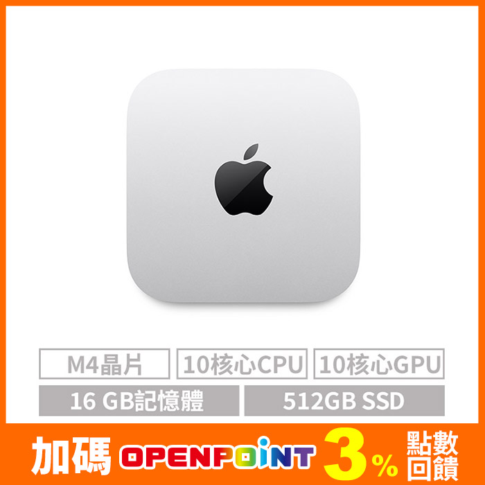 Mac mini M4晶片 10核心CPU 10核心GPU 16GB記憶體 512G SSD輕鬆購機!享3%回饋