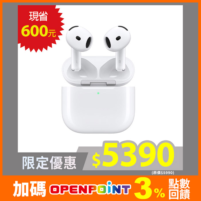 (限量優惠)AirPods 4 主動式降噪款(搭配無線充電盒USB-C)輕鬆購機!享3%回饋原價$5,990特價$5,390