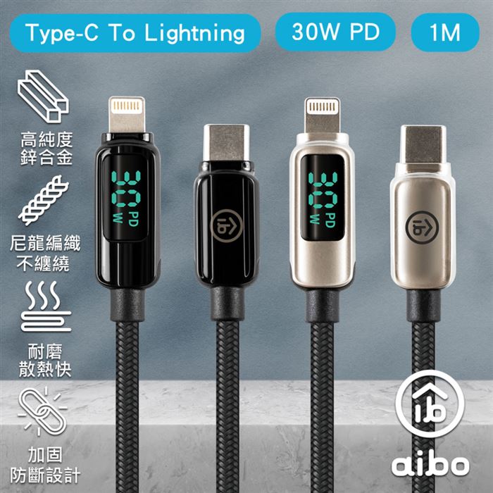 aibo極速Type-C to Lightning PD30W數位顯示傳輸線-黑色智能晶片 數位顯示原價$1,998特價$390