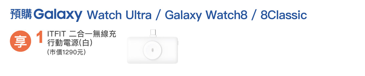 - 指定Galaxy Watch Ultra / Galaxy Watch8 / 8Classic預購享贈ITFIT 二合一無線充行動電源(白) (建議售價NT$1,290),隨主商品一起寄出,顏色恕不接受指定,送完為止。主商品若有申請退貨,贈品行動電須一併完整退回