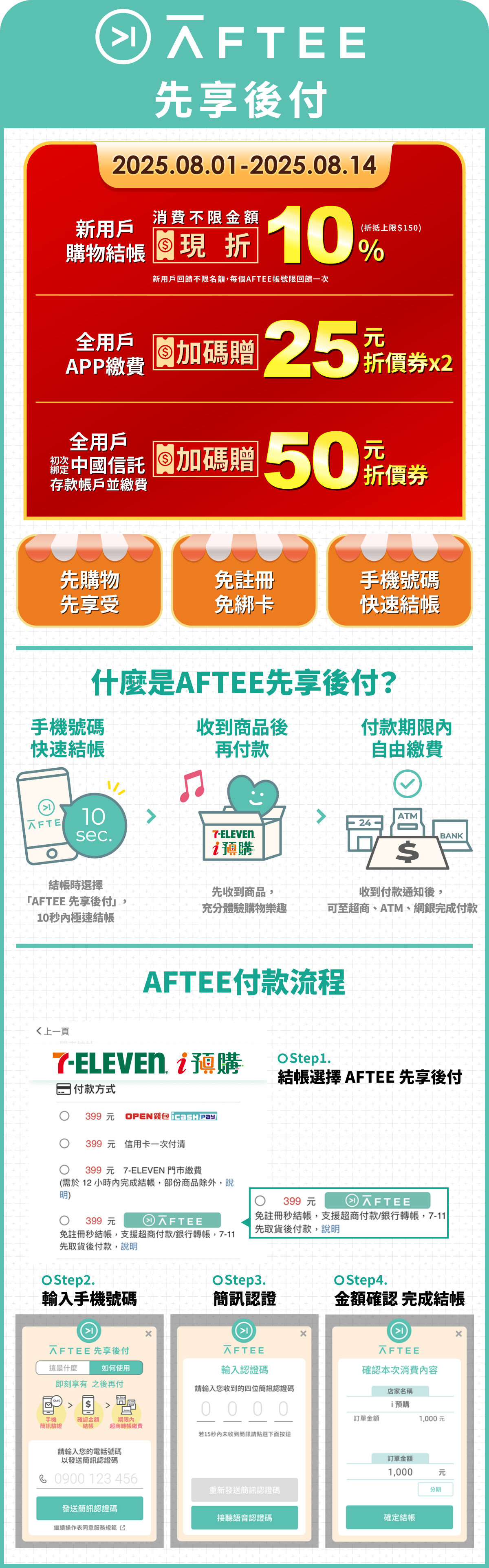 - 活動說明:活動期間內,凡AFTEE新用戶於【 7-ELEVEN i預購/i划算 】消費不限金額,並使用【AFTEE先享後付】結帳,即可享實際消費金額10%現折回饋,單筆訂單現折回饋上限150元。新用戶回饋不限名額。每個AFTEE帳號限回饋一次。