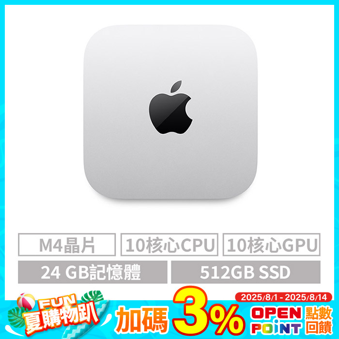 M4晶片 10核心CPU 10核心GPU 24GB記憶體 512G SSD享3%OPENPOINT原價$33900特價$33900