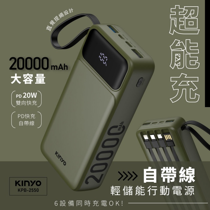 超能充.自帶線輕儲能行動電源(KPB-2550) 20000mAh超大電容量原價$1,580特價$990
