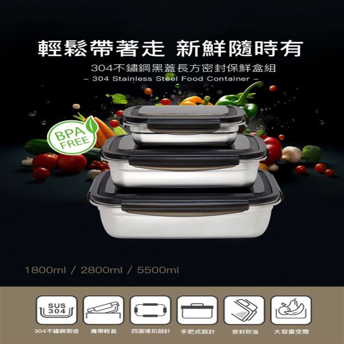 304可微波不鏽鋼黑蓋長方密封保鮮盒組疊疊收納 不占空間原價$1,080特價$799
