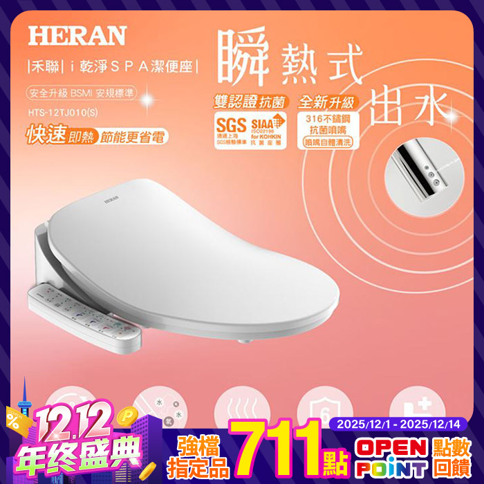 瞬熱式洗淨馬桶座 HTS-12TJ010(S) 基本安裝IPX4防水原價$7990特價$6990