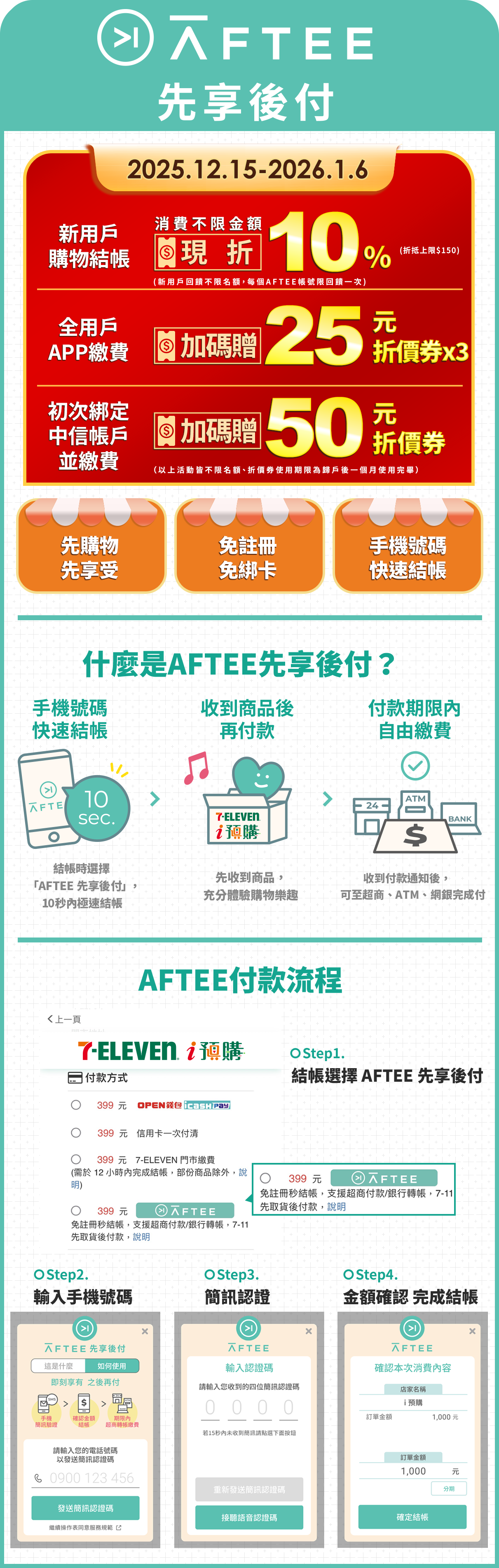 - 活動說明:活動期間內,凡AFTEE全用戶於【 7-ELEVEN i預購/i划算】消費後,且選用【 AFTEE 先享後付 】付款,並使用【 AFTEE APP 】繳費後,即贈「AFTEE 25元折價券3張」。折價券可用於【7-ELEVEN i預購/i划算】下次消費使用。