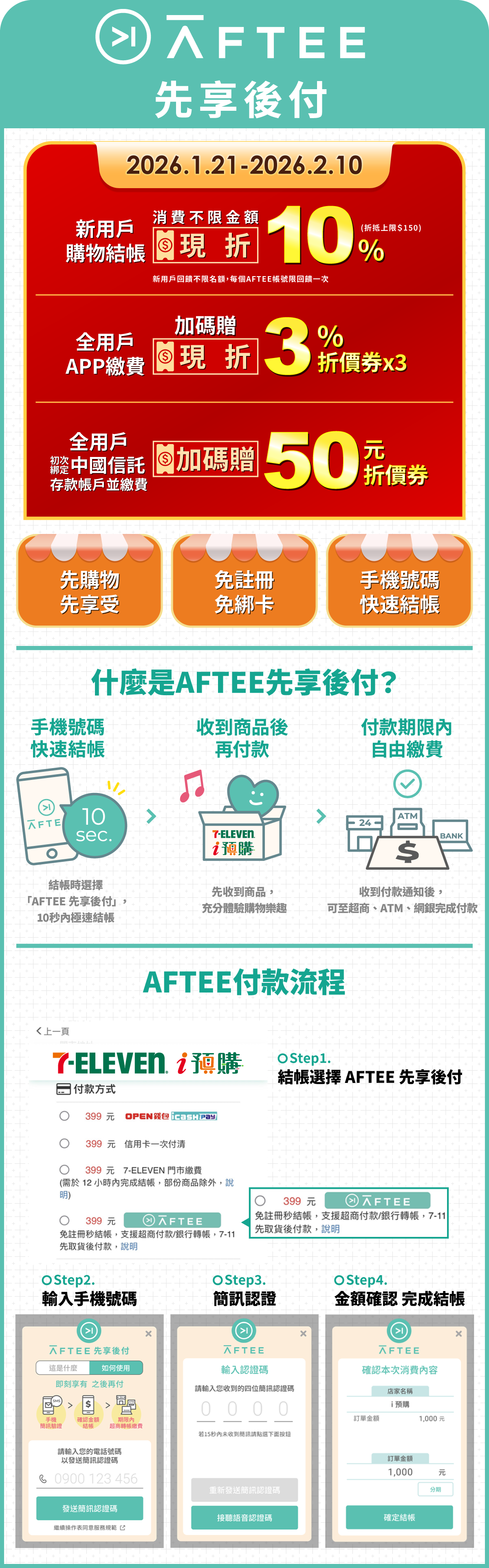 - 活動說明:活動期間內,凡AFTEE新用戶於【 7-ELEVEN i預購/i划算 】消費不限金額,並使用【AFTEE先享後付】結帳,即可享實際消費金額10%現折回饋,單筆訂單現折回饋上限150元。新用戶回饋不限名額。每個AFTEE帳號限回饋一次。