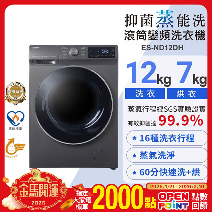 12公斤蒸洗脫烘四合一變頻滾筒洗衣機 ES-ND12DH蒸洗脫烘四合一原價$24900特價$19900