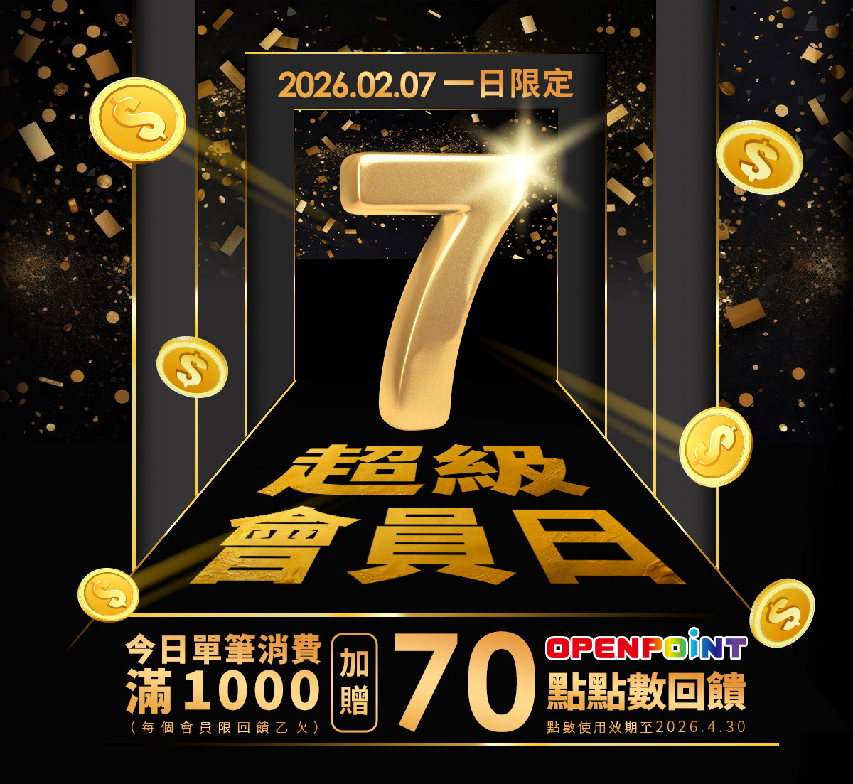 活動期間內,全站單筆實際消費滿$1,000享70點OPENPOINT點數回饋。(每一會員帳號限回饋乙次,上限70點)。本活動之加碼點數於取貨後14天回饋,使用期限至2026/4/30為止,逾期未使用不予補發。